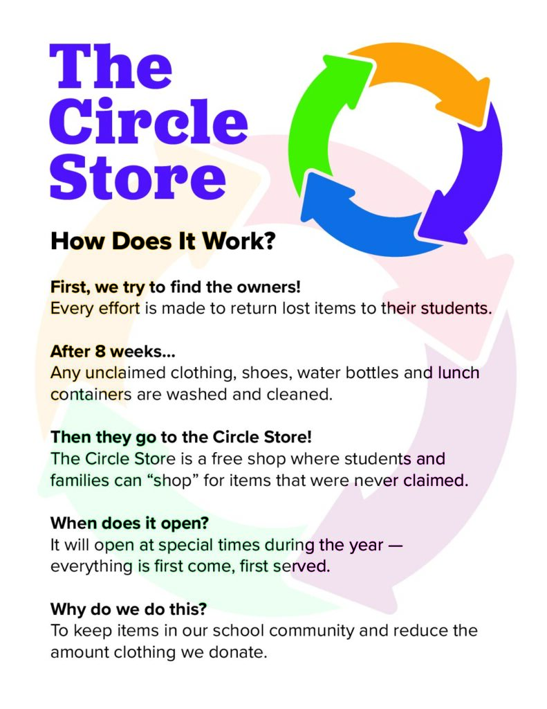 After every effort is made to return lost items to their owners, unclaimed clothing, shoes, water bottles, and lunch containers are added to the Circle Store – a free shop where students and families can “shop” for these items at special times throughout the year.